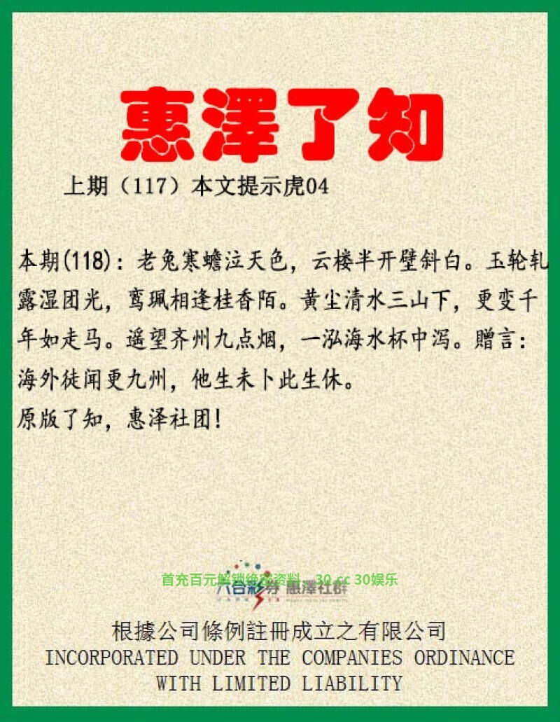 【惠泽了知】102期:天地有万古,此身不再得;人生只百年,此日最易过。意思是天地万古长存,可是人死了就不会再复活;解凶肖鼠牛虎猴狗猪。人的寿命最多百年左右,一天很容易就过去了。解天肖牛兔龙马猴猪。贈言:饱知世事慵开口,看破人情但点头。